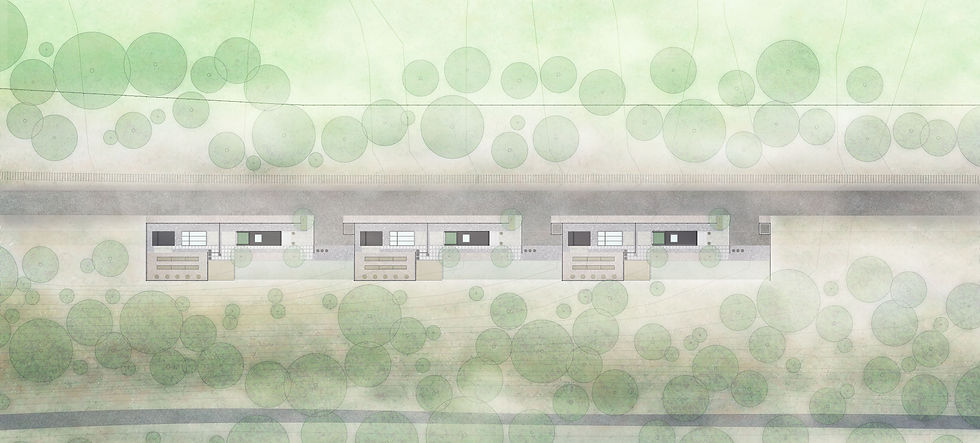 This project consists of three ‘lots’ each with a small residential unit, a greenhouse, a chicken coop, and a dedicated yard. The buildings follow each other in a row with north facing entries and south light in the rear garden areas.